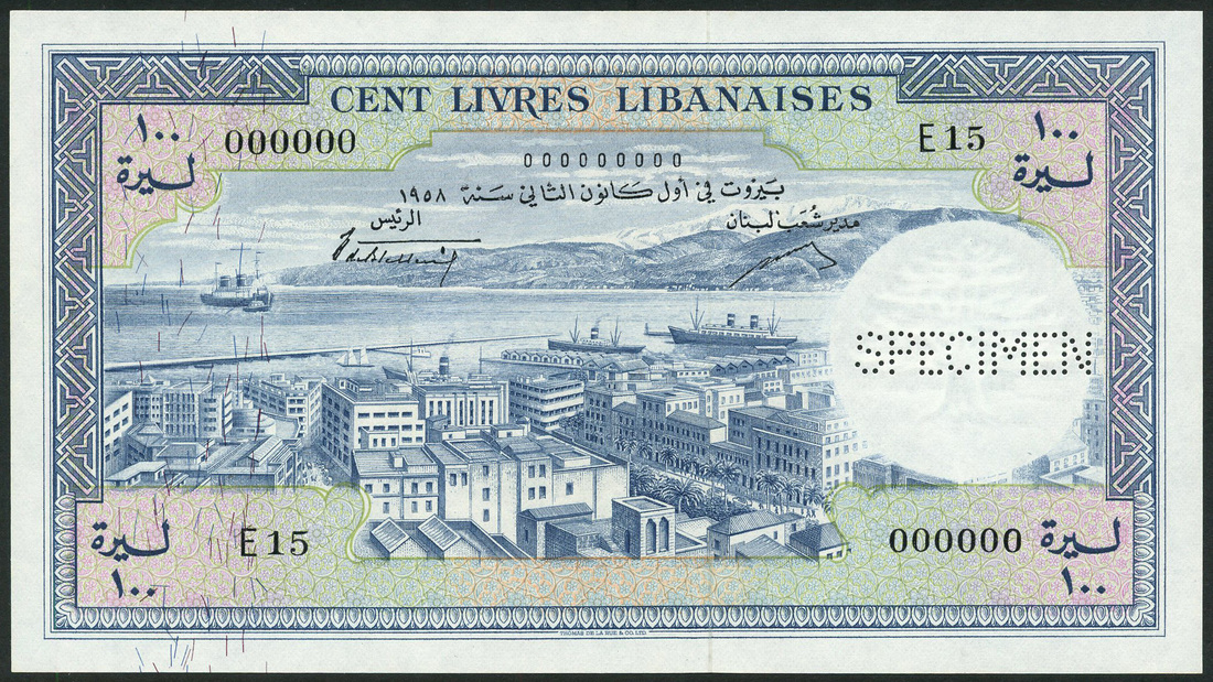 (x) Republique Libanaise, specimen 100 livres, 1958, serial number E15 000000, grey blue on light green and pink underprint, aerial view of Beirut and harbour, mountains in distance, reverse, ornate panel with cedar tree at centre