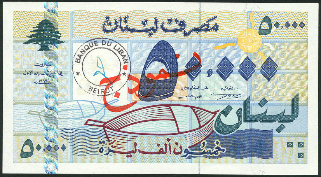 (x) Banque du Liban, Lebanon, specimen 50,000 livres, 1999, zero serial number, blue and green, Cedar tree at top left, two stylized boats reverse, blue on multicolour, Cedar tree, guilloche pattern, bar code, red SPECIMEN overprint, bank handstamp over watermark window