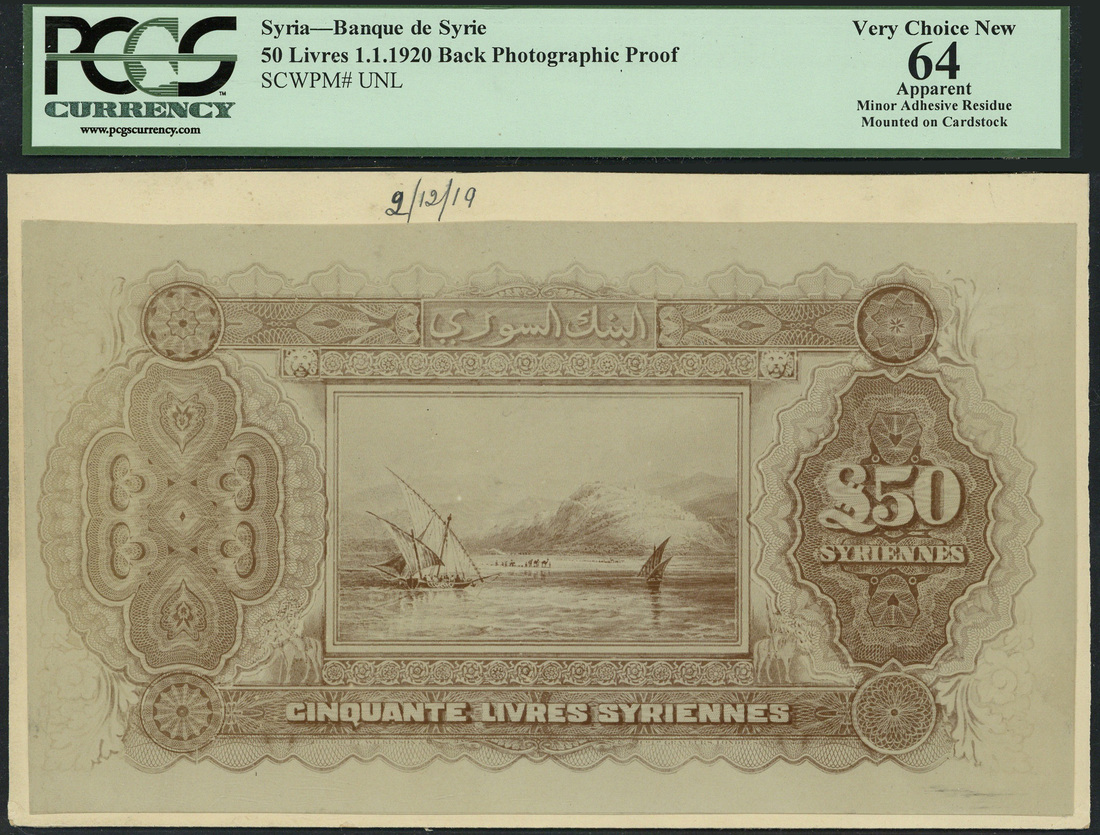 (x) Banque de Syrie, Syria, obverse and reverse archival photographs showing a design for 50 livres syriennes, 1 January 1920, black and white, street scene at left, reverse shoreline and fishing boats at centre