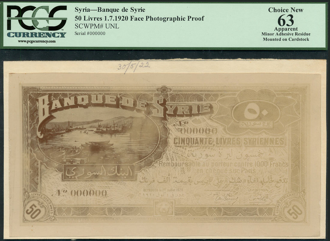 (x) Banque de Syrie, Syria, obverse and reverse archival photographs showing a design for 50 livres syriennes, 1 July 1920, black and white, harbour scene at top left, value at corners, reverse, rocky promontary with buildings at centre