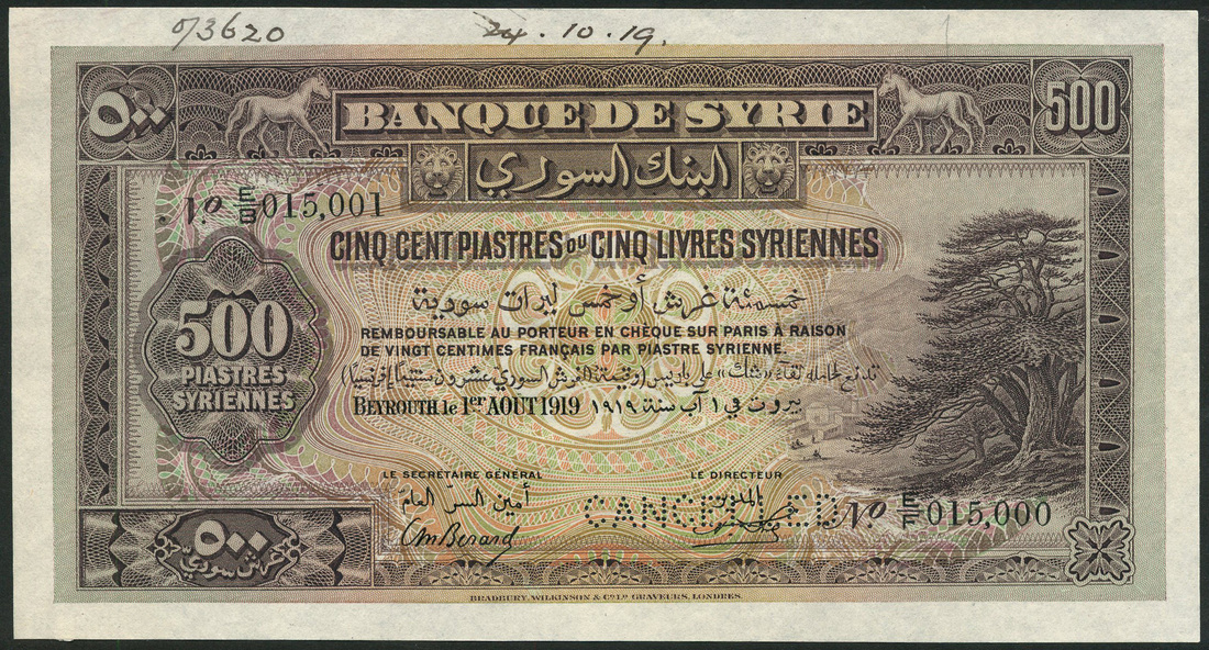 (†) Banque de Syrie, Syria, specimen 500 piastres, 1919, serial range E/F015,000-E/B015,001, brown on multicolour underprint, cedar tree at right, bank title top centre flanked by white horses, value in ornate tablet at left, reverse, aerial city view