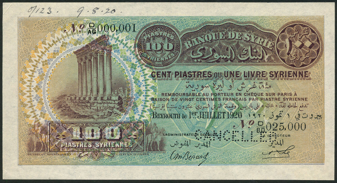 (†) Banque de Syrie, Syria, specimen 100 Piastres, Beyrouth, 1 July 1920, purple and blue-green, the pillars at Baalbeck at left, reverse vignette of view of Beirut set in columns, perforated CANCELLED