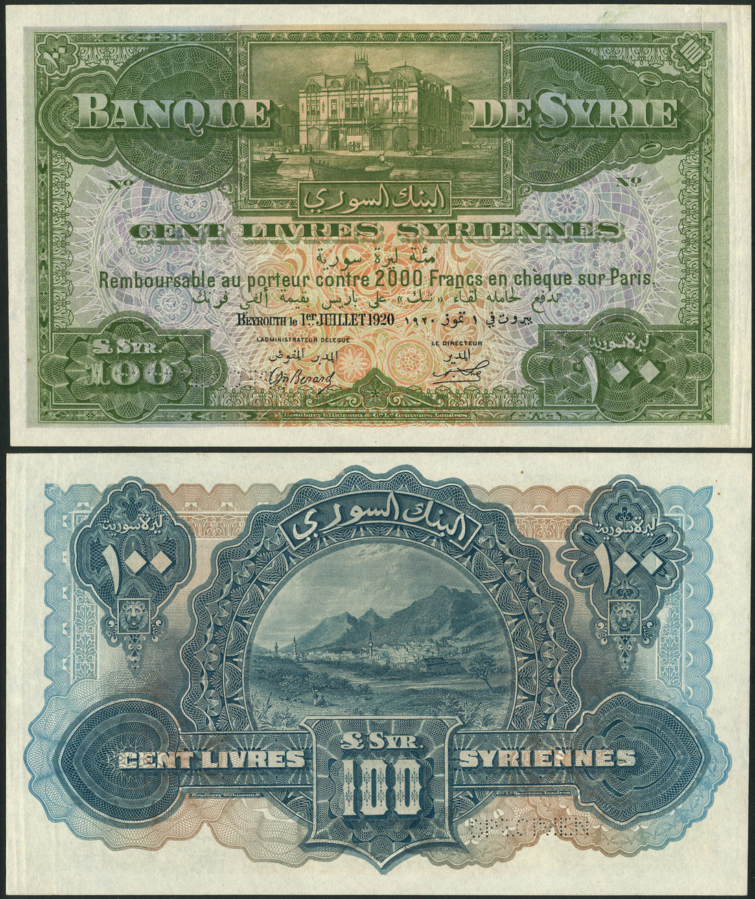 (x) Banque de Syrie, Syria, specimen 100 livres, 1920, no serial number green and multicoloured, the Bank of Beyrouth at centre on quayside, reverse green, city view