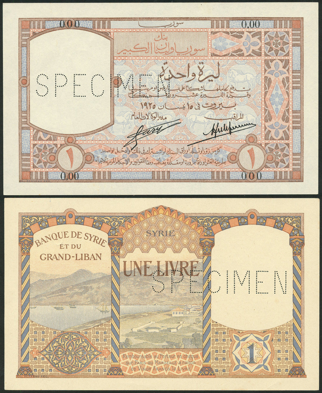 (x) Banque de Syrie et du Grand-Liban, Syria, specimen obverse and reverse 1 livre, 1925, zero serial numbers, pale blue and brown, value low left and right, elaborate scrollwork around, reverse blue, brown and multicolour, pillars and coastline, blue SYRIE top centre