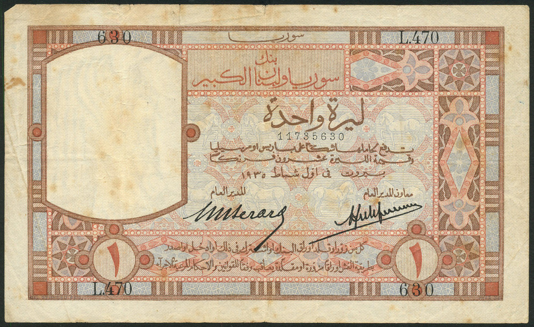 (x) Banque de Syrie et du Grand-Liban, Syria, 1 livre, 1935, serial number A.538 815, pale blue and brown, geometrical patterns in field, Berard and Laferriere signatures, SYRIE 1939 in field, reverse pale blue and brown, Jounieh's Bay near Beirut and columns, SYRIE in pale blue top centre