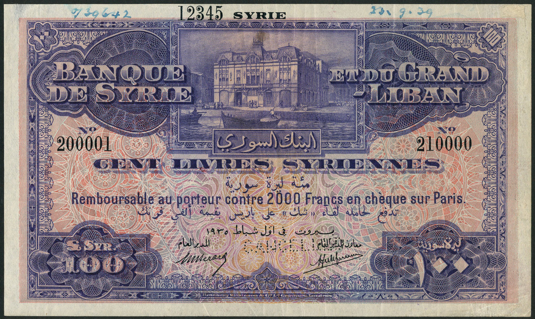 (†) Banque de Syrie et du Grand-Liban, Syria, printer's archival specimen 100 Livres, 1 February 1935, serial number 200001-210000, purple and multicoloured, Bank of Beyrouth at upper centre, reverse brown, blue, orange and pink, vignette of town, river and mountains,