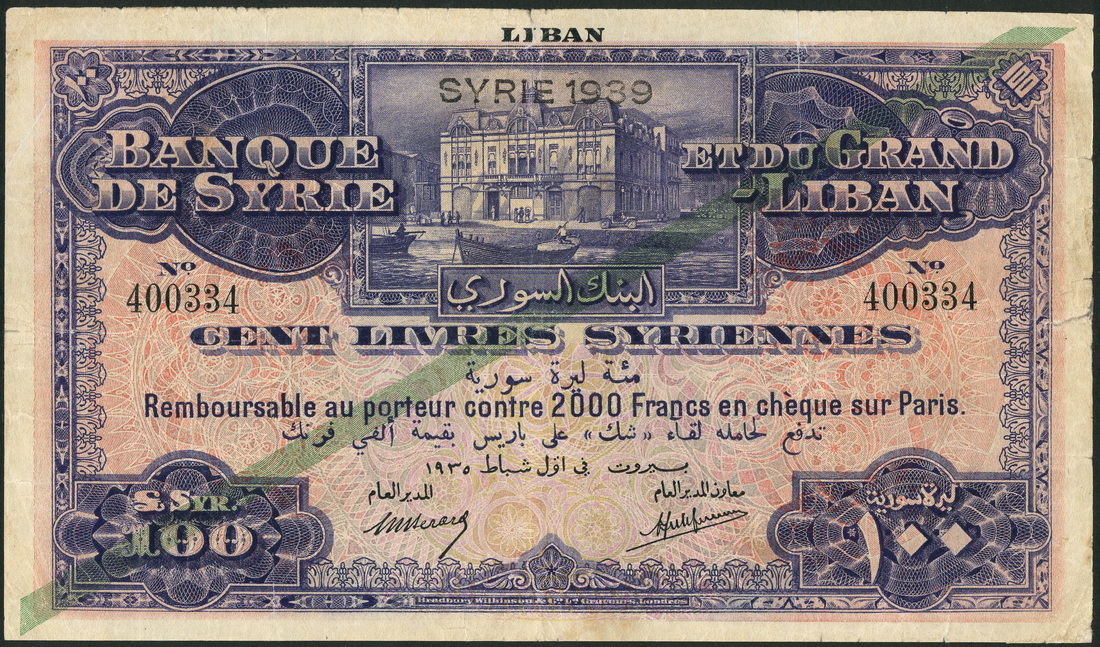 Banque de Syrie et du Grand-Liban, Syria, 100 livres, 1935, serial number 400334, blue and pale pink and orange, Central Bank building on quay side at top centre, value at centre and low left and right, pale green line across face, SYRIE 1939 overstamp top centre, Berard and Laferriere signatures, reverse brown, pale blue and orange and pink, view of Antioch in circular frame at centre, value at left and right