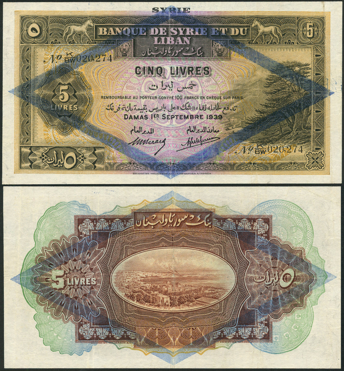(x) Banque de Syrie et du Liban, Syria, 5 livres, 1939, serial number K/BW 020,274 brown and multicoloured, Cedar tree at right, lozenge overprint