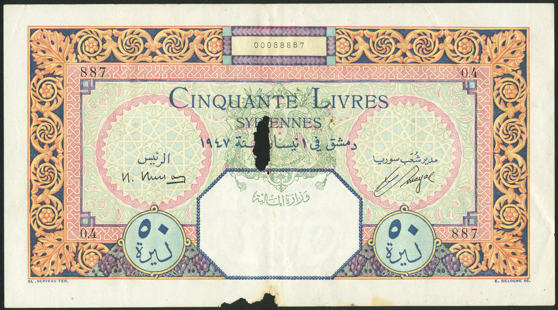 Banque de Syrie et du Liban, Syria, 50 livres, 1947, serial number 00088887, green Republic seal at centre, 50 livres, 1938, serial number R.36 00891487, with black 'SYRIE 1939' overprint, both pale pink, blue and multicoloured, value in blue low left and right, ornate scrollwork in field, reverse multicoloured, house at centre, 100 livres, 1930, serial number H.11 00007385, red, green yellow, reverse multicolour, view of Damascus, black 'Syrie 1939' overprint