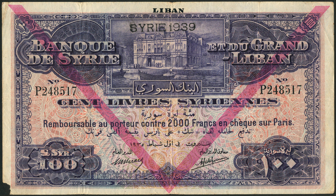 (x) Banque de Syrie et du Grand-Liban, Syria, 100 livres, 1935, serial number P248517, blue and pale pink and orange, Central Bank building on quay side at top centre, value at centre and low left and right, purple chevron across face, SYRIE 1939 overstamp top centre, LIBAN in top margin, Berard and Laferriere signatures, reverse brown, pale blue and orange and pink, view of Antioch in circular frame at centre, value at left and right