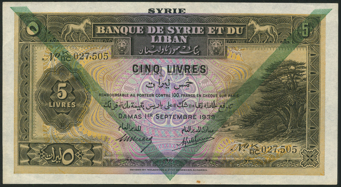 Banque de Syrie et du Liban, Syria, 5 livres (2), 1 September 1939, serial number K/BC 027,505, K/BF 060,278, brown on multicolour underprint, Cedar of Lebanon at right, value at left and corners, horses at top left and right, reverse brown, coastal city view at centre, green overprint