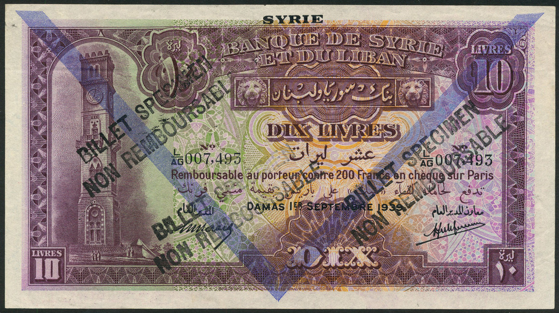 (x) Banque de Syrie et du Liban, Syria, specimen 10 livres, 1 September 1939, serial number L/AG 007,493, purple and multicoloured, the clock tower in Aleppo at left, Berard and Laferriere signatures, blue chevron across face of the note, reverse purple, ruins and feluccas at centre in oval frame, value at left and right