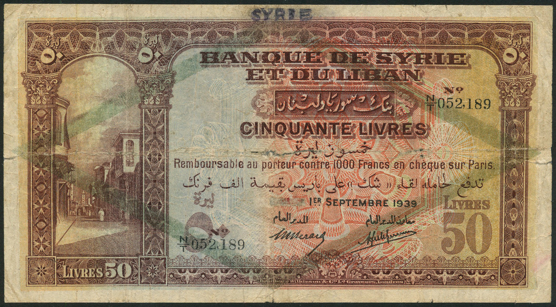 Banque de Syrie et du Liban, Syria, 25 livres, 1 September 1939, serial number M/N 076,210 and M/O 050,184, purple and pale blue, green and pink, camel train and cemetery at centre, 50 livres, 1 September 1939, serial number N/T 052,189, brown on multicolour, street scene at left