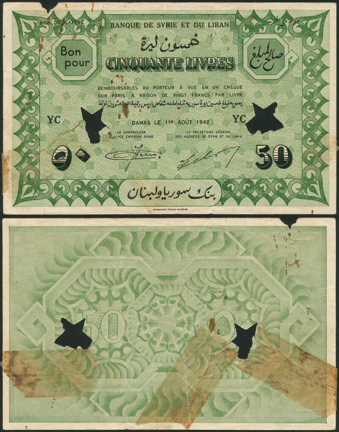 (x) Banque de Syrie et du Liban, Syria, 50 livres, 1 August 1952, prefix YC, green, value low left and right, two printed signatures below, reverse green, value at left and right, two star perforation in serial number field