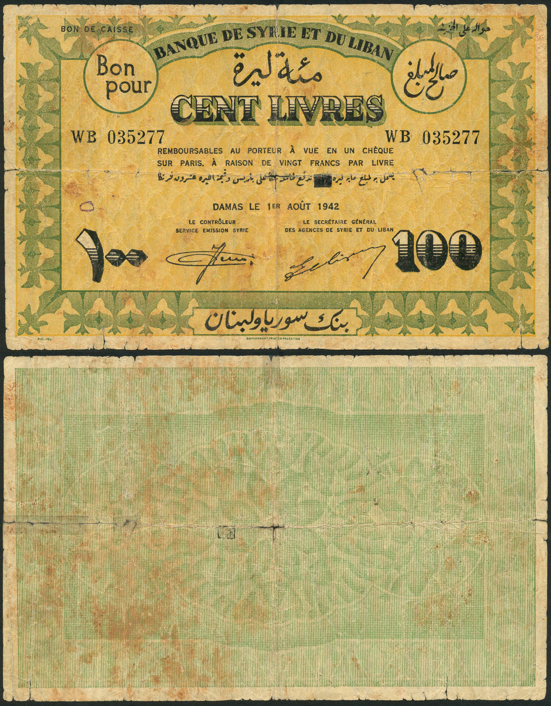 (x) Banque de Syrie et du Liban, Syria, 100 livres, 1942, serial number WB 035277, green and pale yellow, value, reverse green, value