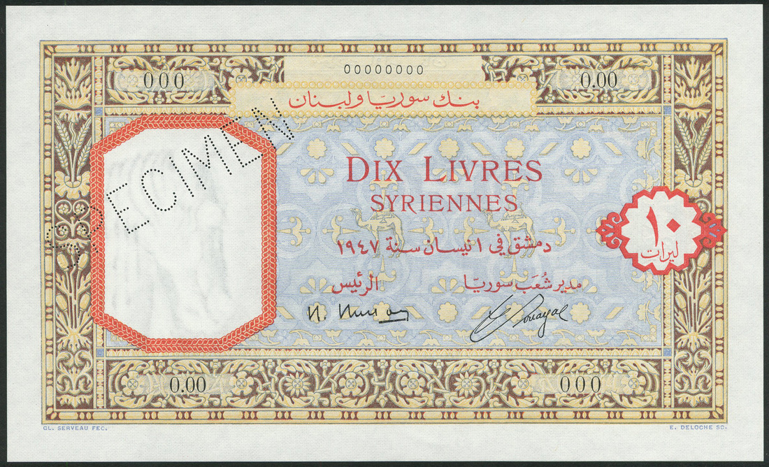 (x) Banque de Syrie et du Liban, Syria, specimen 10 livres, 1 July 1947, zero serial numbers, pale brown, blue and multicoloured, value in red at right, Busson and Souayal signatures at left, reverse red and blue, the Temple of Mercury at centre, value in red at each corner