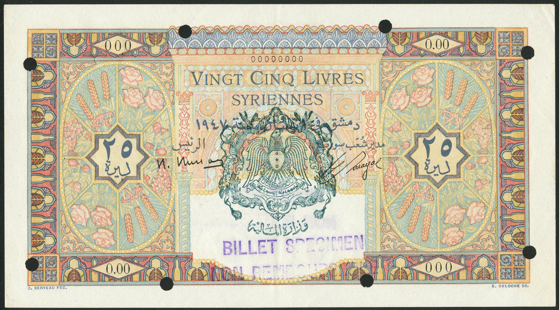(x) Banque de Syrie et du Liban, Syria, specimen 25 livres, 1947, zero serial number, multicoloured, ornate border and design, value in blue at left and right, green Syrian arms handstamped at centre, reverse castle, 'Krak des Chevaliers', at centre, ornate flower designs at left and right
