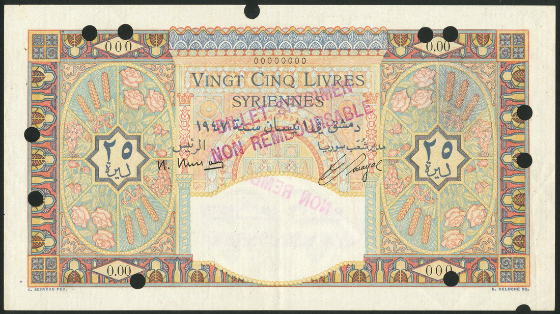 (x) Banque de Syrie et du Liban, Syria, specimen 25 livres, 1947, zero serial number, multicoloured, ornate border and design, value in blue at left and right, reverse, castle, 'Krak des Chevaliers', at centre, ornate flower designs at left and right