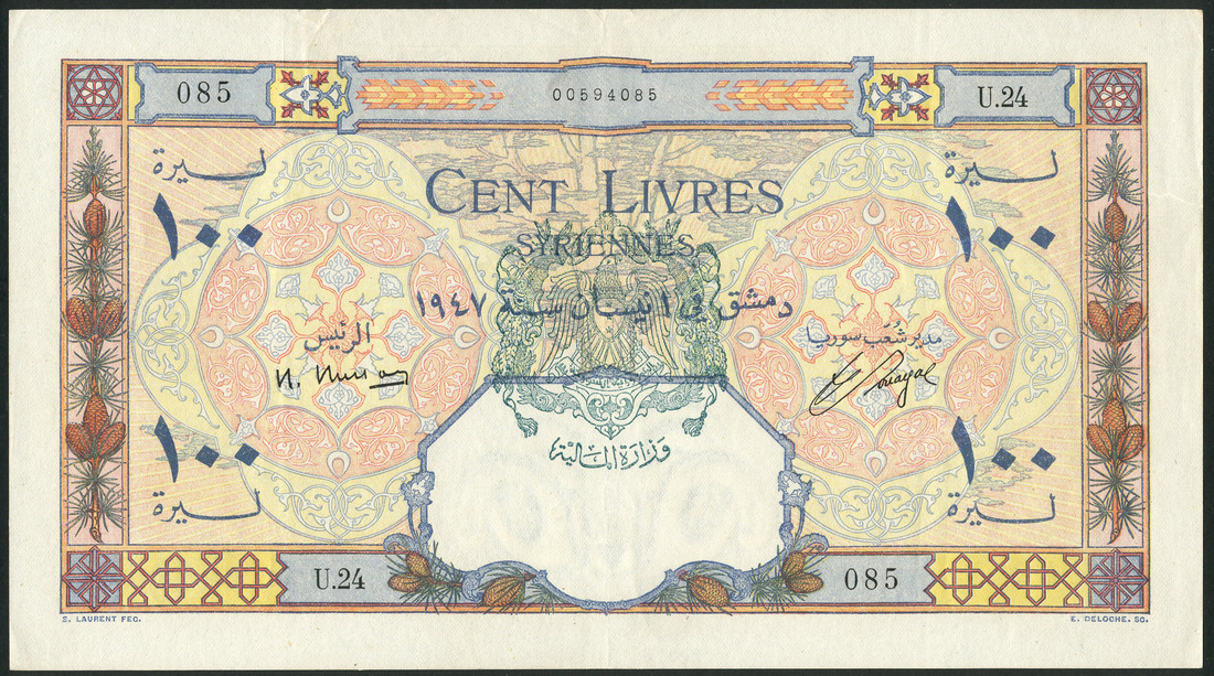 Banque de Syrie et du Liban, Syria, 100 livres, 1947, serial number U.24 00594085, multicoloured, ornate designs and borders, dark green State arms and Ministry of Finance handstamp of eagle top centre, Busson signature at left, reverse Mosque and city view, incense burner at left and right