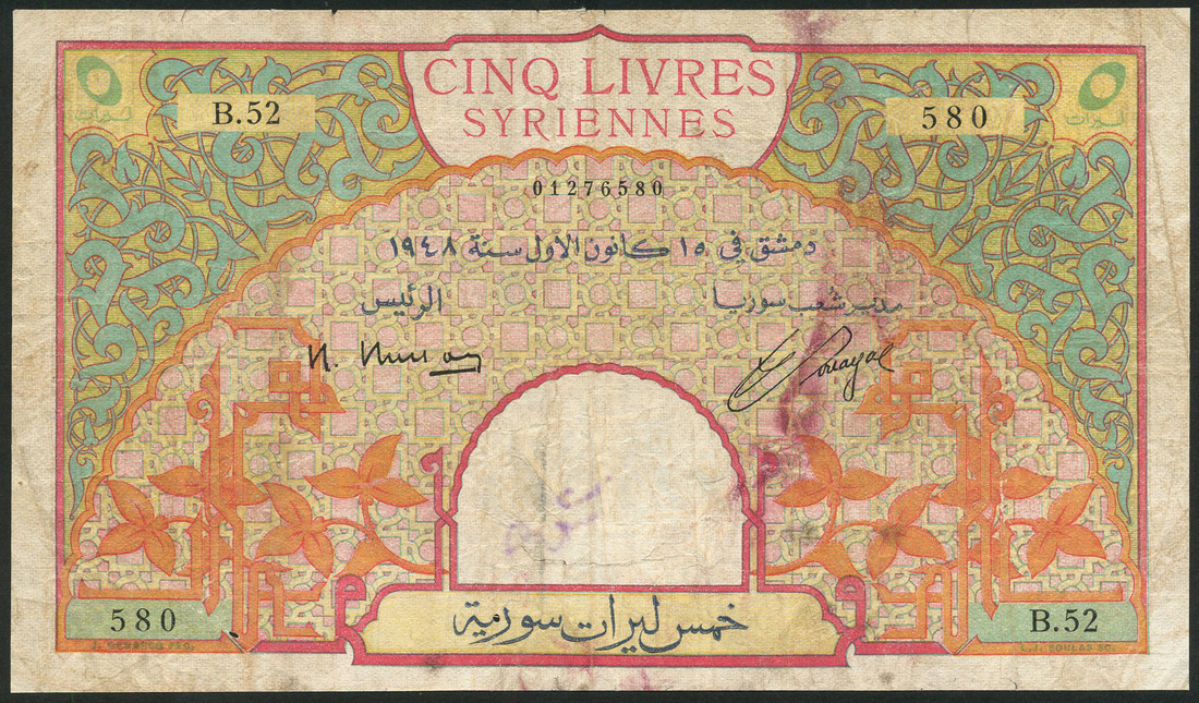 Banque de Syrie et du Liban, Syria, 5 Livres, 1948, zero serial number B.52 580, Busson and Souayal signatures, blue-green, pink and orange on yellow underprint, ornate scrollwork at upper left and right, stylised flowers at lower left and right, reverse Azem Palace in rectangular frame at centre