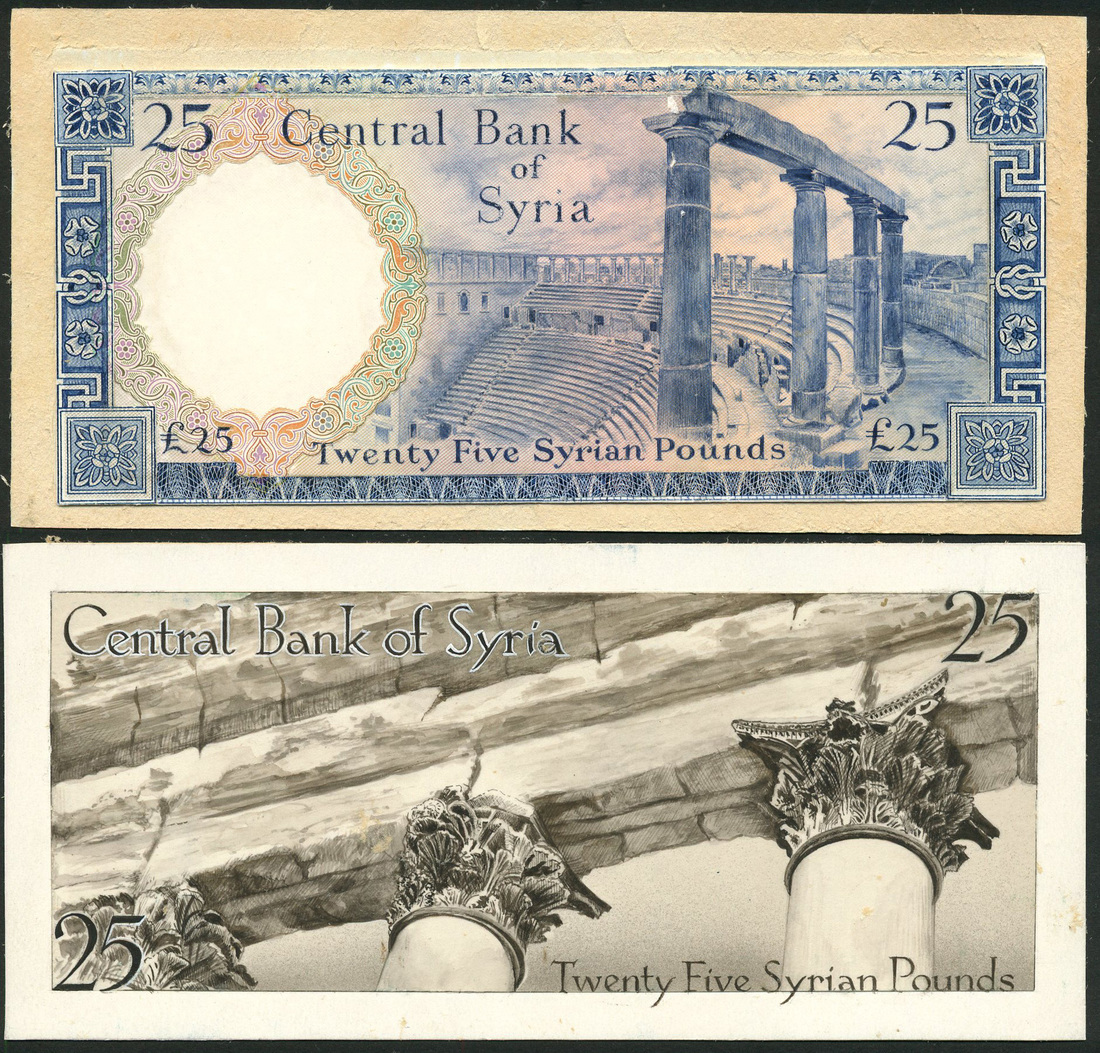 (†) Central Bank of Syria, obverse and reverse composite essay on card for a 25 Pounds, ND (ca 1957), dark blue and multicoloured, amphitheatre at Palmyra, reverse brown-black, decorated columns from the colonnade at Palmyra