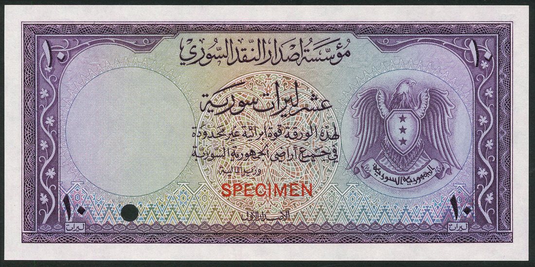 (†) Institut d'Emission de Syrie, specimen colour trial 10 Livres, ND (ca 1950), no serial numbers, purple and multicoloured, arms at right, reverse Tekkiye Suleimanie in Damascus, overprinted SPECIMEN horizontally in red on obverse and reverse, one punch hole