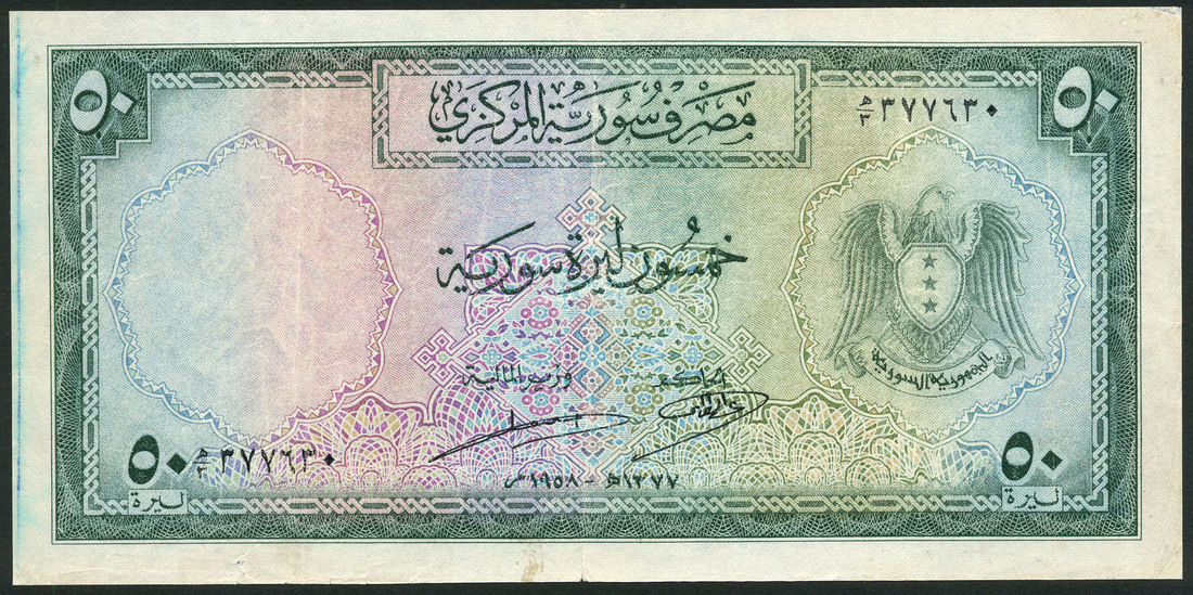 (x) Central Bank of Syria, 50 livres, 1958, serial number 377630 green on multicolour underprint, arms at right, ornate detail in background at centre, reverse, inner yard of Azem Palace in Damascus, elaborate panel at left and right