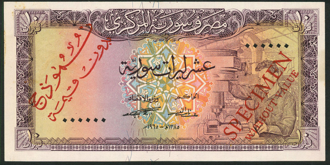 (x) Central Bank of Syria, specimen 10 Syrian pounds, 1958, zero serial number, purple on multicolour underprint, man operating machinery at right, highly ornate border and background detail at centre, reverse, courtyard of Omayad Mosque