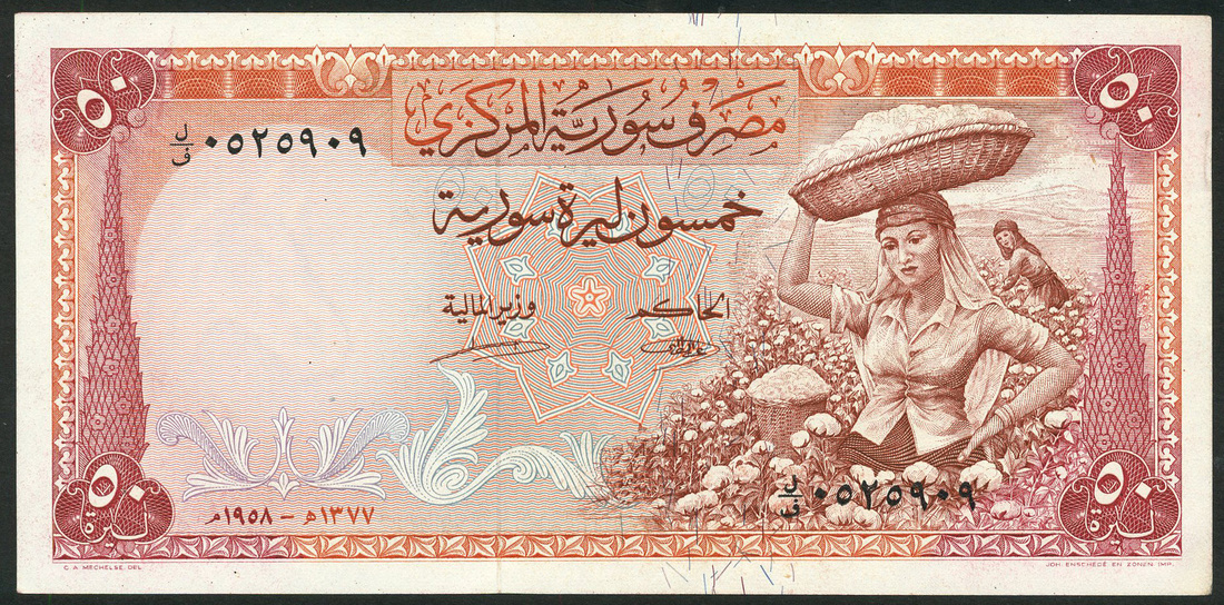 (x) Central Bank of Syria, 50 Syrian pounds, 1958, serial number 0525909, red on multicolour underprint, cotton harvesting at right, ornate border with value in each corner, reverse, view of Damascus