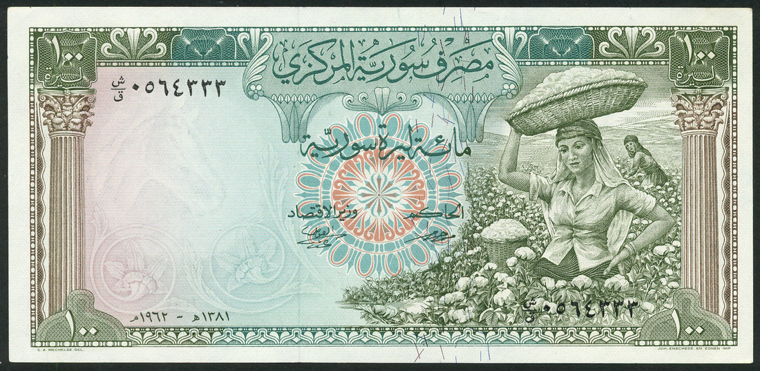 Central Bank of Syria, 100 pounds (3), 1958, serial numbers 0564329, 0564330, 0564333, green, brown and blue, column at left and right, woman with wicker basket in cotton field at left, ornate border, reverse, ancient ruins of Hadrian’s gate and row of columns in Palmyra, Hosni Al Sawaf signature