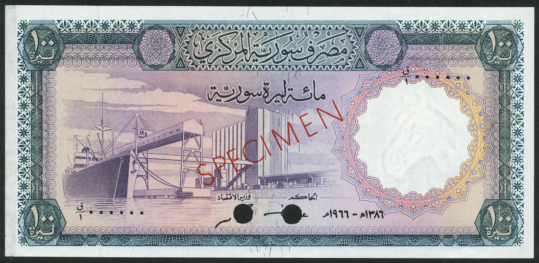 (†) Central Bank of Syria, specimen 100 Pounds, 1966, serial numbers Q/1 000000, green, purple and multicoloured, port installation at left, reverse brown, dam at centre, overprinted SPECIMEN diagonally in red on obverse and reverse, two punch holes; also specimen 100 Pounds (2), 1978, green, blue and brown, Palmyra ruins at centre, bust of Queen Zenobia at right, reverse grain silos at Latakia