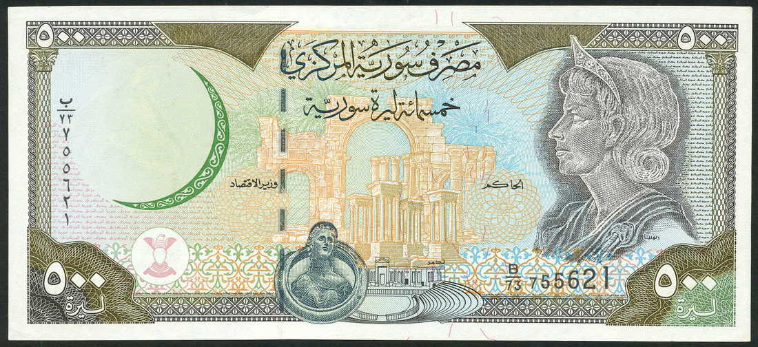 (x) Central Bank of Syria, progressive proofs for £50 and £100, 1977, first, green and light tan, outline of statue and dam, reverse, border colour only, date low right, second, multicolour, outline of Queen Zenobia and Palmyra ruins, reverse, light green and blue border only, both with horse's head watermark, also, specimen £25, 1970, zero serial number, man operating loom at left, reverse, Bosra theatre, together with £500, 1998, serial number B/73 755621, Queen Zenobia at right, Palmyra ruins at centre