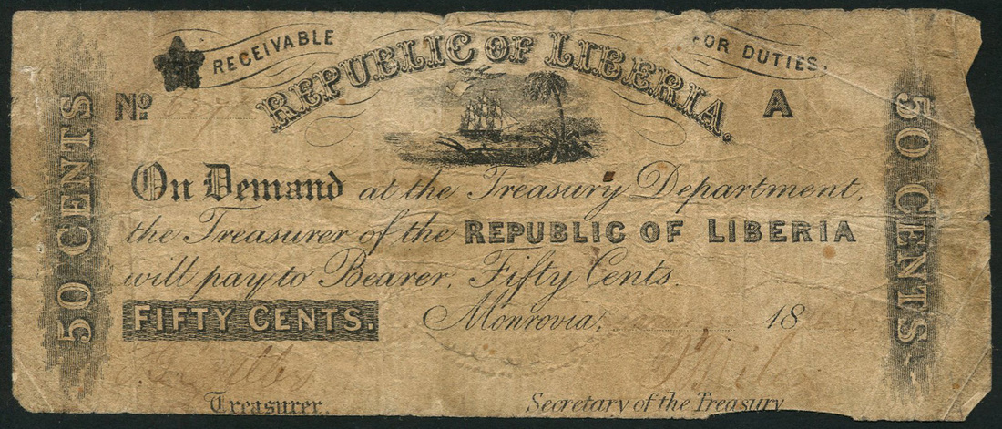 (x) Republic of Liberia, 50 cents, 24 January 1876, serial number A6271 (?), black and white, sailing ship and palm at top centre, value at left and right, handstamped black star at top left