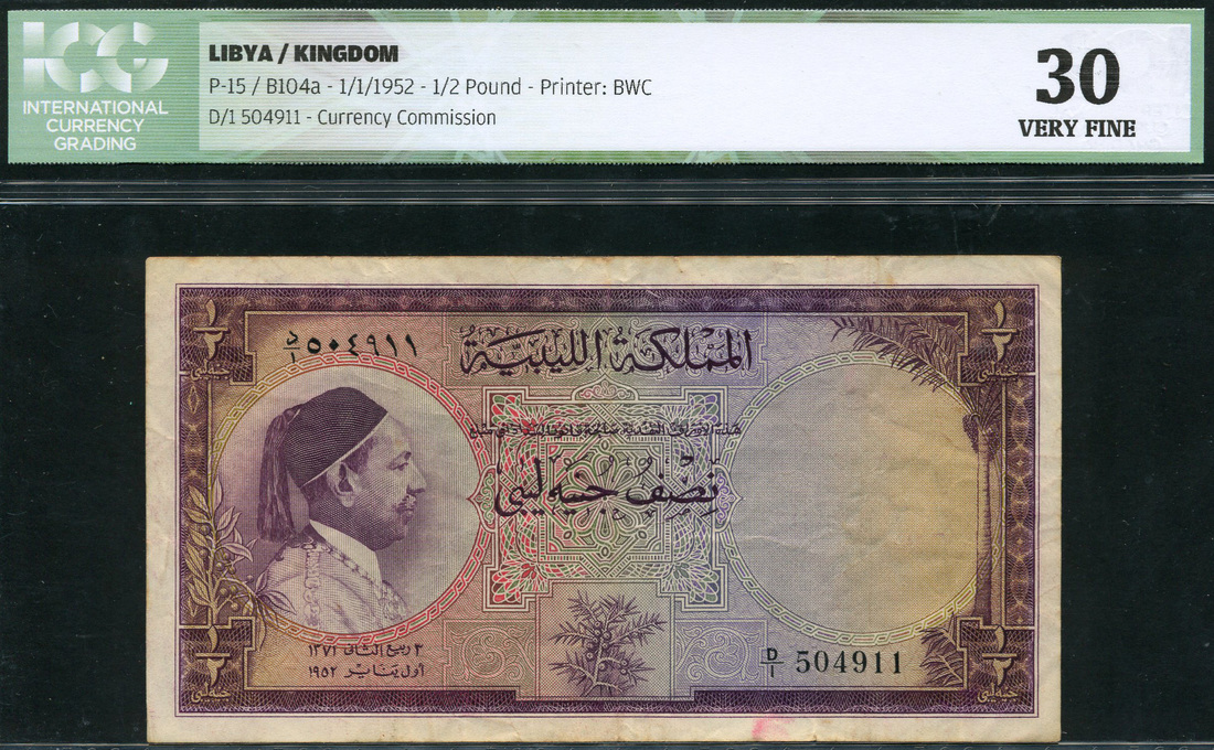 Kingdom of Libya, 1/2 pound, 1 January 1952, serial number D/1 504911, purple on multicolour underprint, King Idris at left, value at each corner, reverse purple, value at centre and corners