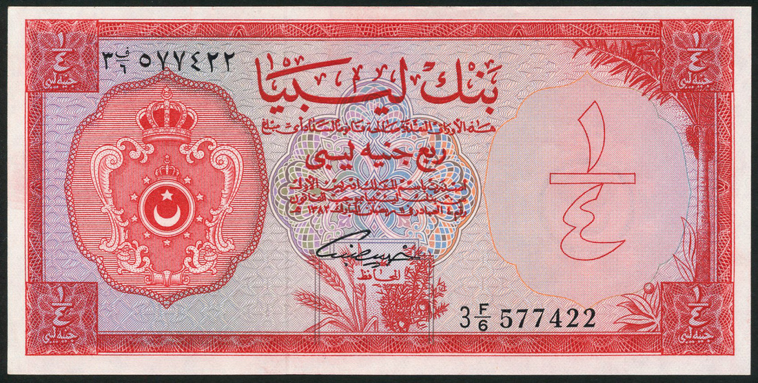 Bank of Libya, consecutive pair 1/4 pound, 5 February 1963, serial number 3 F/6 577421-2, red on multicolour underprint, arms at left, value at right and each corner, reverse red, value at centre and corners, Khalil Al Bennani signature