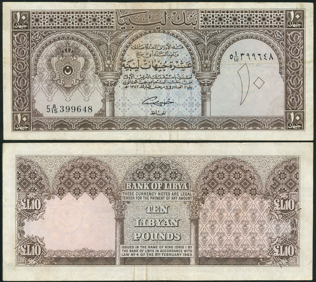 (x) Bank of Libya, £10, 1963, serial number 5 A/15 399648, brown and blue, arms at left, value at right, Al Aneizi signature