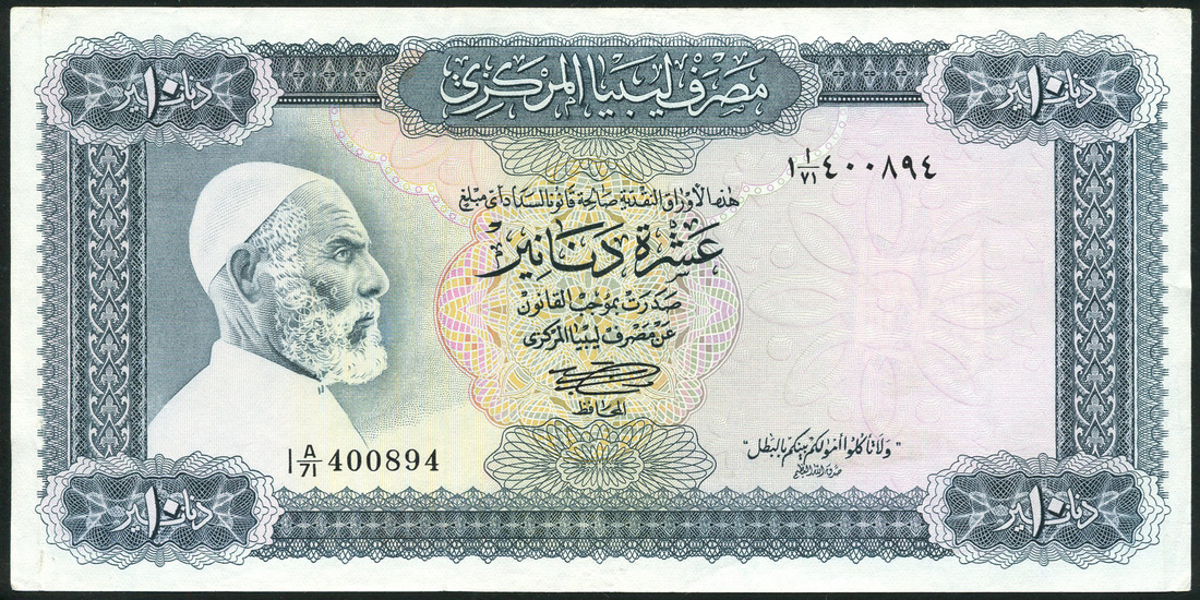 Central Bank of Libya, a set from the 1972 issue comprising 1/4 dinar, prefix I E/4, orange, 1/2, prefix I D/6, purple, 1 dinar, prefix I C/30, blue, 5 dinars, prefix I B/19, olive green, 10 dinars, prefix I A/71, blue