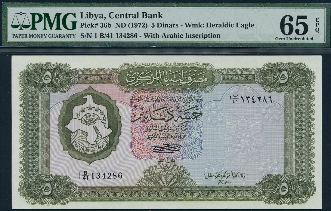 Central Bank of Libya, 5 dinars (2), ND (1972), consecutive serial numbers B/41 134286/7, olive green, light blue and pink, shield with cog and map of Middle East and North Africa in at centre left, value in each corner, ornate border, reverse, walled fortress