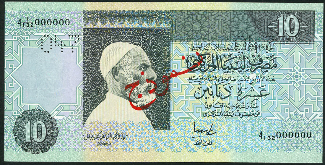 Central Bank of Libya, Socialist People's Republic, specimen 10 dinars, ND (1989), serial number 4 1/132 000000, blue and green on multicolour, Omar El Mukhtar at left with geometric pattern in background, reverse green, Crowd and hilltop fortress, red SPECIMEN overprint in Arabic, perforated
