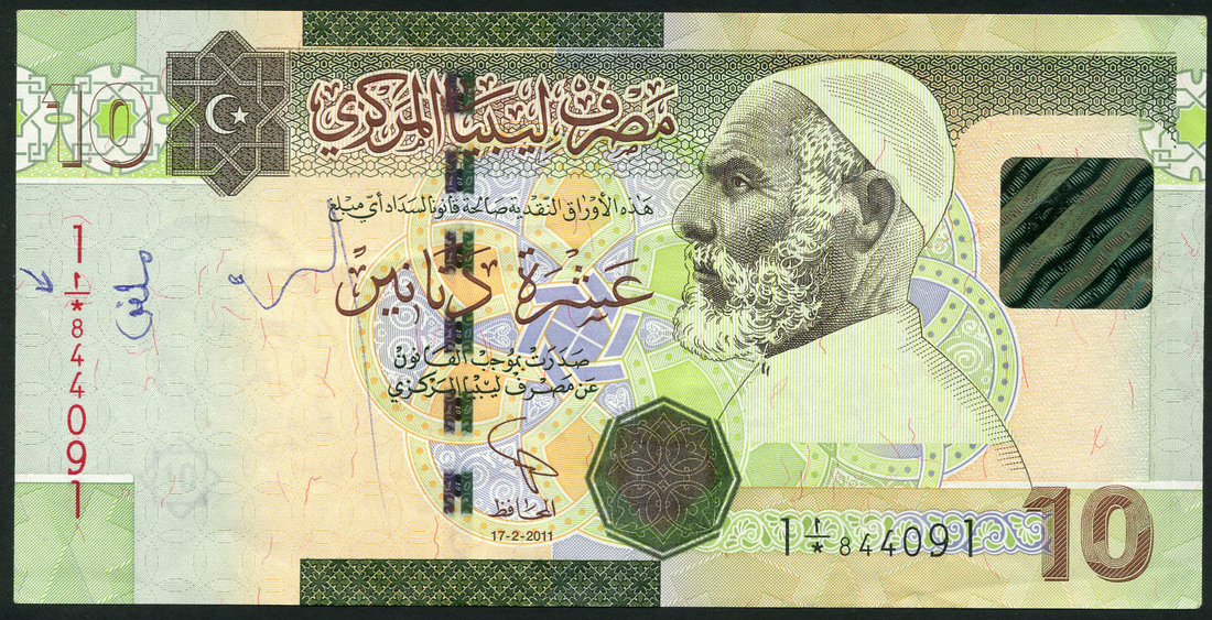 Central Bank of Libya, 10 dinars, 17 February 2011, serial number 1 1/* 844091, green on multicolour, Omar El Mukhtar at right, reverse green and orange, crowd and hilltop fortress in Sabha