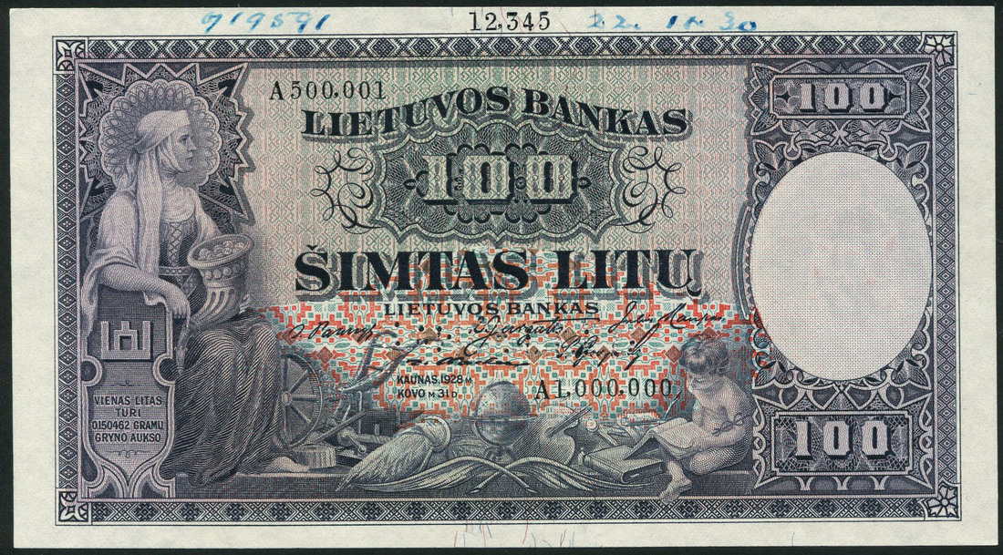 (†) Lietuvos Bankas, Lithuania, specimen 100 Litu, Kaunas, 1928, serial numbers A 500001-A 1000000, slate purple and multicoloured, seated woman with cornucopia and plough at left, value at upper centre, child reading, globe and wheatsheaf at lower centre, reverse building set in decorated frame, value in each corner