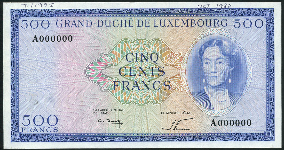 (†) Grand-Duche de Luxembourg, a group of progressive proofs for 500 Francs, ND (ca1982), comprising 1. Obverse with blue, pink, orange and green guilloche and underprint, reverse yellow and violet guilloche and underprint; 2. Uniface reverse with yellow and violet guilloche and underprint only; 3. Obverse with blue, pink, orange and green guilloche and underprint, reverse complete with Ducal Palace; also specimen 500 Francs, ND (ca 1982), serial number A000000, blue and multicoloured, portrait of Grand Duchess Charlotte at right, reverse Ducal Palace