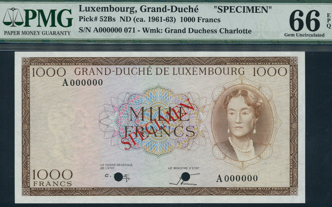 (x) Grand-Duche de Luxembourg, specimen 1000 Francs, ND (c1963), serial number A000000, brown on multicoloured underprint, portrait of Grand Duchess Charlotte at right, value in words in guilloche at centre, reverse crowned coat of arms at centre, value in guilloche at left and in each corner