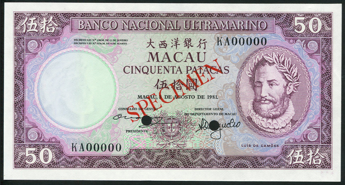 Banco Nacional Ultramarino, Macau, a group of specimens of the 8 August 1981 Issue comprising, 5 Patacas, serial number AA00000, green, temple at right; 10 Patacas, serial number CA00000, brown, lighthouse at right; 50 Patacas, serial number KA00000, purple, Luis de Camoes at right; and 100 Patacas, serial number LA00000, blue, Camilo Pessanha at right, all with signature title PRESIDENTE at left, all overprinted SPECIMEN diagonally in red on obverse and reverse, two punch holes