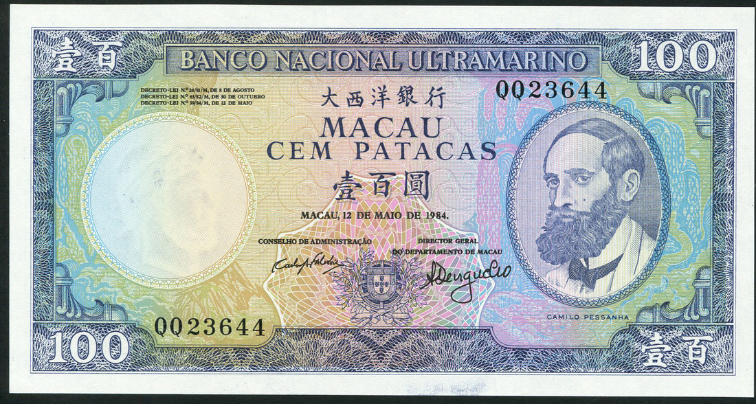 Banco Nacional Ultramarino, Macau, 100 patacas, 12 May 1984, serial number QQ 23644, blue on multicolour underprint, Pessanha at right, arms at low centre, reverse blue, view of Macau