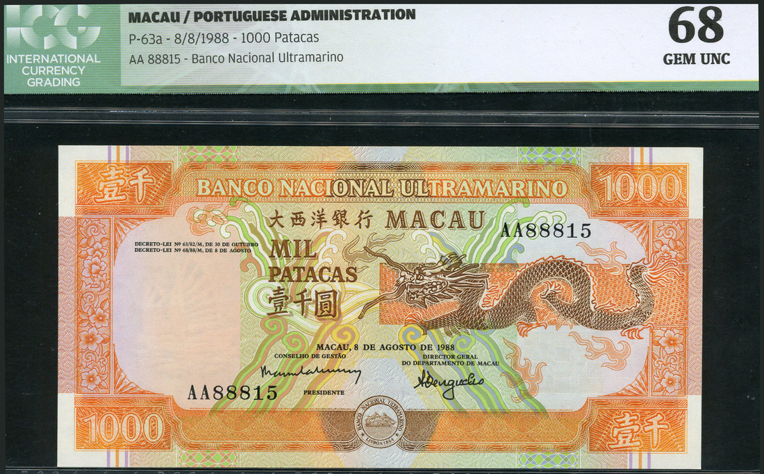 Banco Nacional Ultramarino, Macau, 1000 patacas, 1988, serial number AA88815, orange on multicolour underprint, dragon at right, bank title top centre, value in each corner, ship seal low centre, reverse, view of Macau