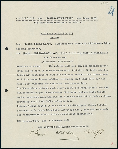 Kasino-Gesellschaft. Max. 8% Schuldschein, Anleihe 100 Reichmark, Mühlhausen /Thür. 1.11.1928. #13. VF.