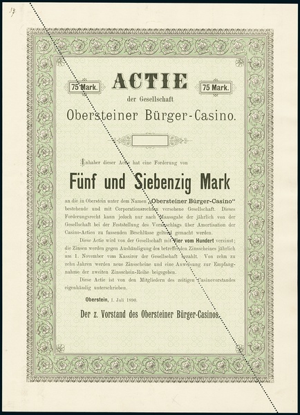 Obersteiner Bürger-Casino. Actie 75 Mark, Oberstein, 1.7.1890. Unissued. EF.