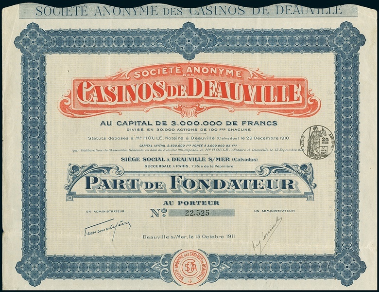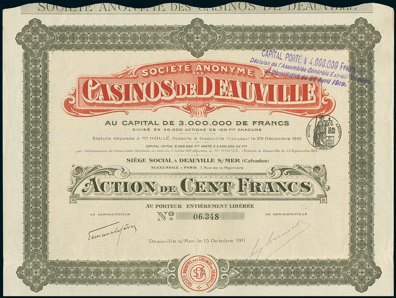 Casino de Deauville. (Lot 2 items) a) Part de Fondateur, Deauville s/Mer 15.10.1911, #22525. EF. b) Action F100, Deauville s/Mer 15.10.1911, #06348. EF.