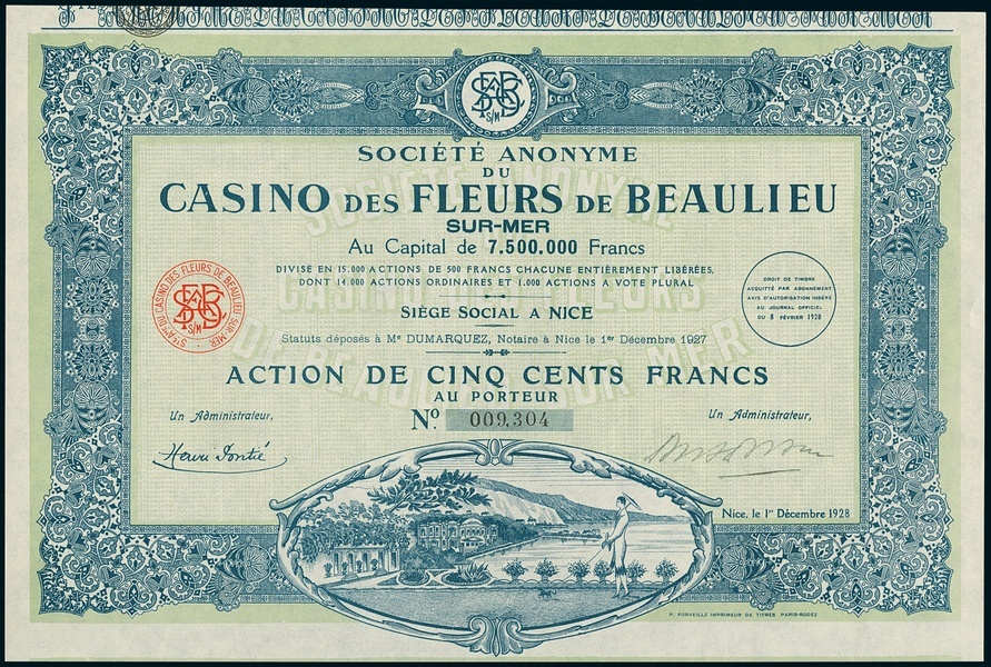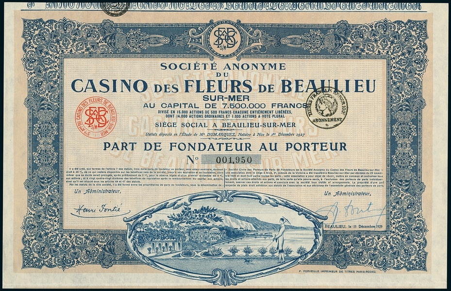 Casino des Fleurs de Beaulieu sur-mer. Lot 2 different items. a) Action F500, Nice 1.12.1928, #009304. EF; b) Part de Fondateur, Beaulieu 15.12.1929 (1.12.1927), #001950. EF.